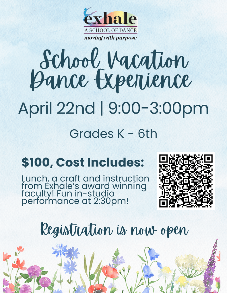 *Grades K-6th (will be broken up by age group throughout the day when necessary) Cost includes lunch, a craft and instruction from Exhale’s award winning faculty!